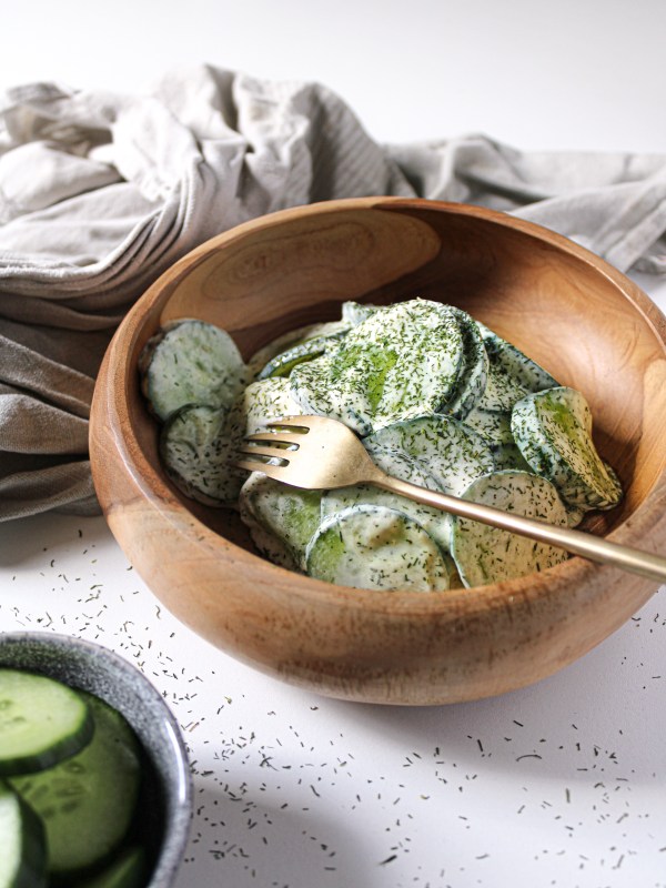 Snij de komkommer in dunne plakjes en vermeng ze door de yoghurtdressing.