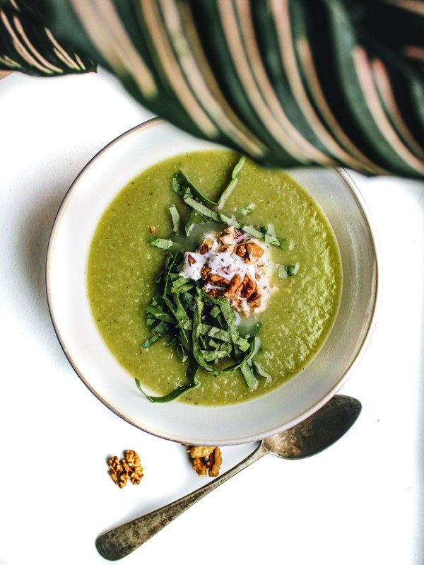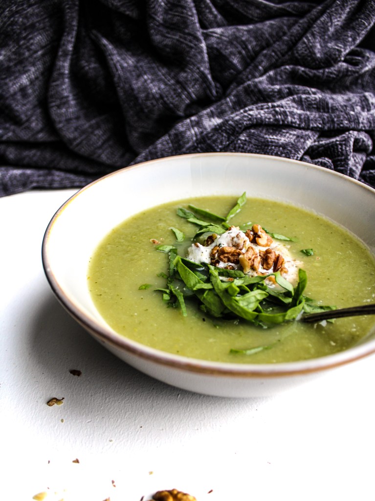 Een witloofsoepje met reepjes verse bladspinazie en een yoghurtdressing van look, dille en walnoten.