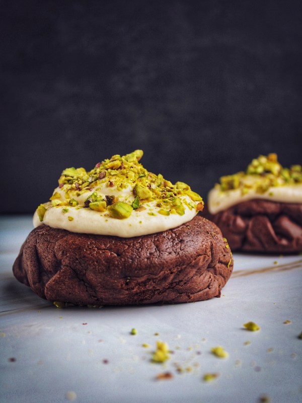 Haal de cakes uit de oven, spuit er de mascarponemousse op en werk af met de gecrunchte pistachenoten.