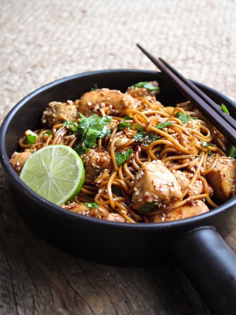 - Kook ondertussen de noedels beetgaar en giet ze af in een vergiet. Laat er wat koud water over stromen, laat ze goed uitlekken en doe ze dan in de wokpan bij de gegaarde kip.
