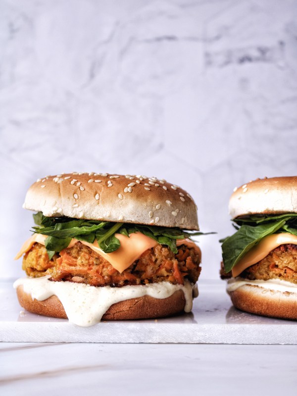 - Beleg de bodem van de broodjes met de saus, de burgers, de sneetjes smeltkaas, de bladspinazie en het bovenste deel van het broodje. Smakelijk! Lekker, lekker, lekker!