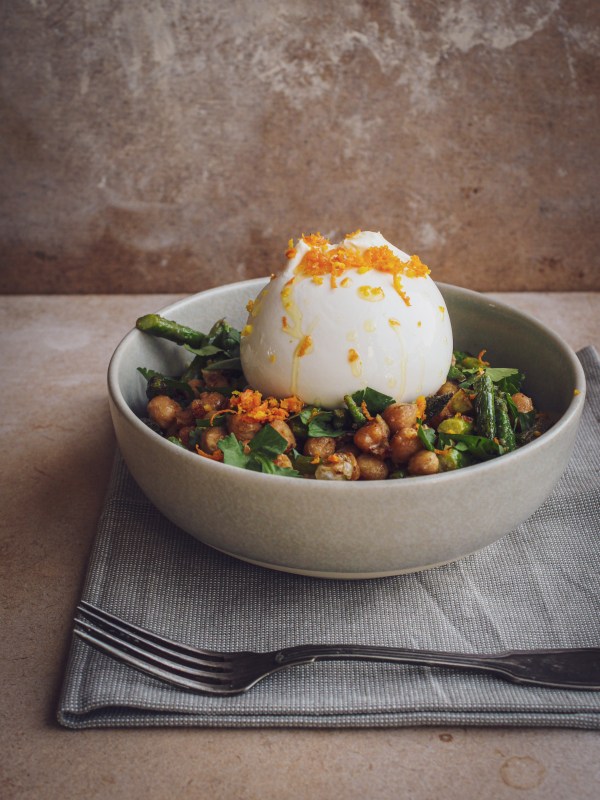 - Verdeel de bereiding in twee schaaltjes of kommetjes en leg er de burrata op.