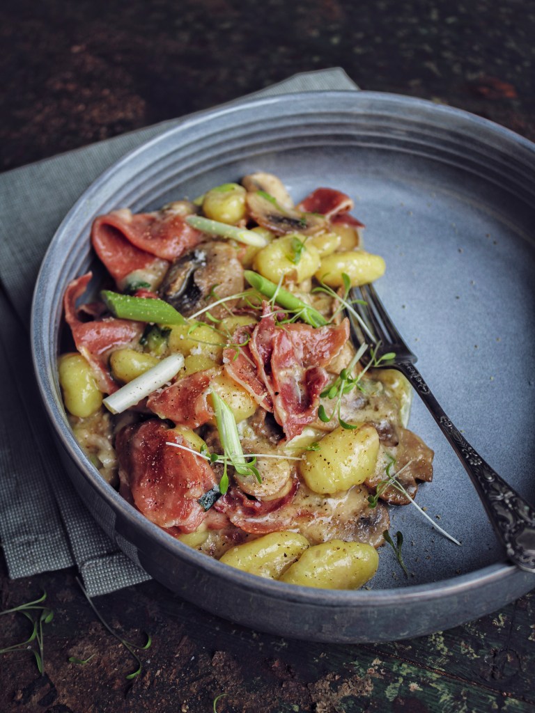 - Verdeel de gnocchi in twee borden en werk af met de bosui, takjes tuinkers, peper en grof zeezout. Smakelijk!