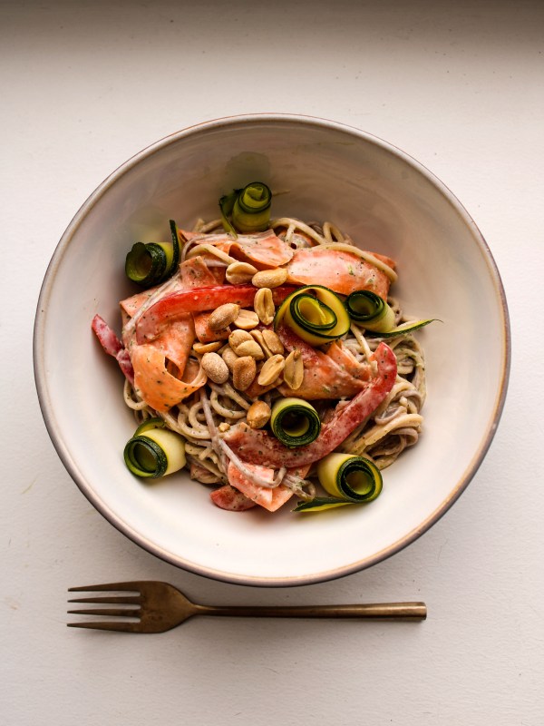 - Kook de noedels al dente, giet ze af in een vergiet en laat er koud stromend water over lopen.