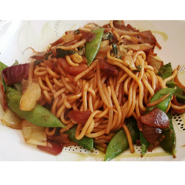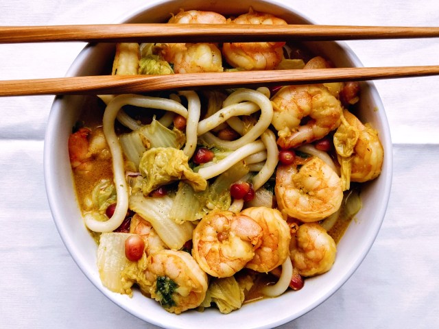 Udon in yellow curry with shrimps,Chinese cabbage and pomegranate